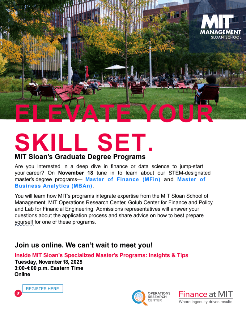 MIT Sloan admissions advisors will be hosting a virtual information session on November 18th from 3:00-4:00 pm for BC students interested in learning more about master’s programs in finance or analytics. The information session will help students explore how MIT Sloan’s Master of Finance and Master of Business Analytics programs will prepare them for impactful careers in finance and data science, get application tips on how to highlight their academic and professional experience, and learn how MIT Sloan’s curriculum prepares them to reach their career goals. There will also be an opportunity to ask questions about the programs. Please register using this link.