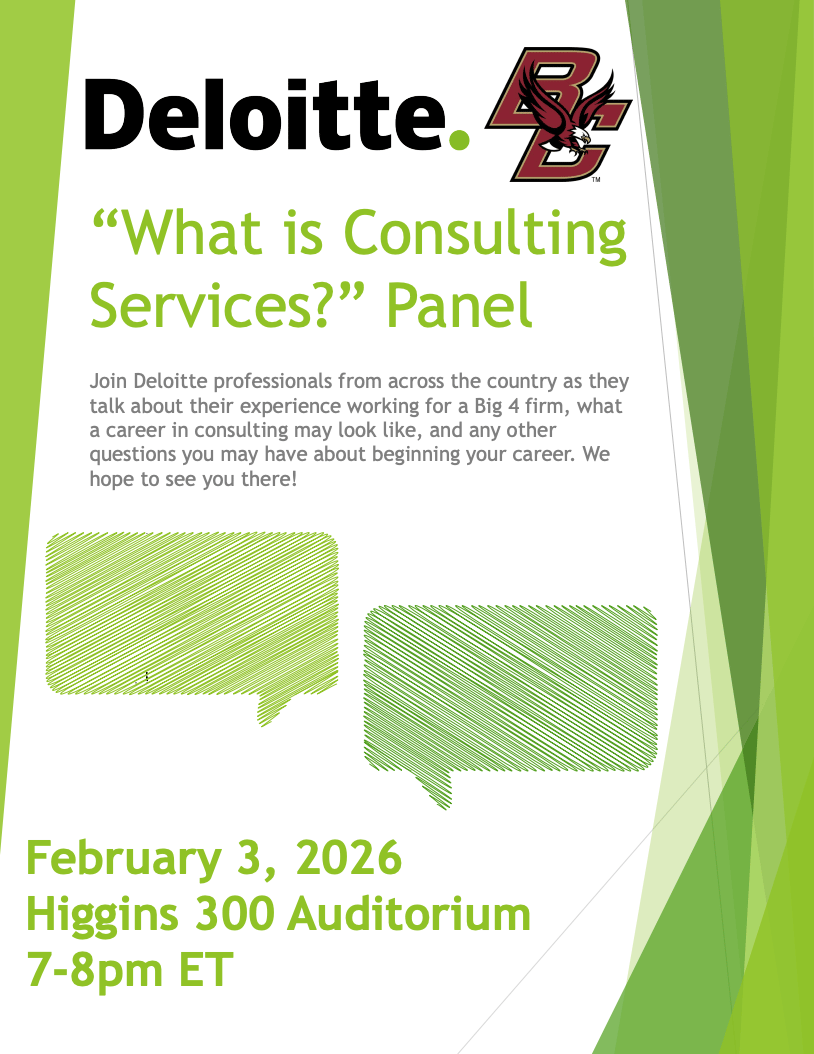 Deloitte will be hosting a Demystifying Consulting Panel on Tuesday, February 3rd from 7:00-8:30 pm in Higgins Room 300. The panel will discuss an introduction to Deloitte and consulting, examples of how real-life skills translate to work in the industry, and insights into career opportunities and recruiting pathways at Deloitte. There will also be a chance for an open Q&A and networking with professionals. This is a great opportunity for students to network and learn more about consulting.