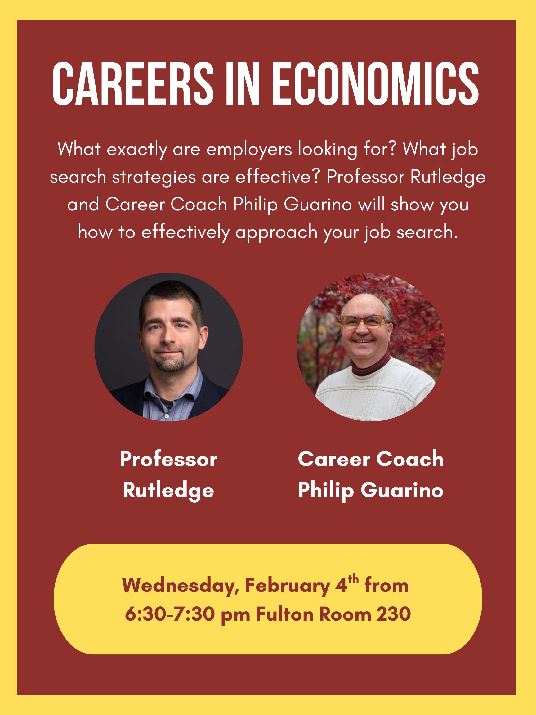 Join us for a discussion with Philip Guarino from the BC Career Center and Professor Matthew Rutledge from the Economics Department on the career paths open to economics majors, job search tips, and industry insights. The event will take place on Wednesday, February 4th from 6:30-7:30 pm in Fulton Room 230.