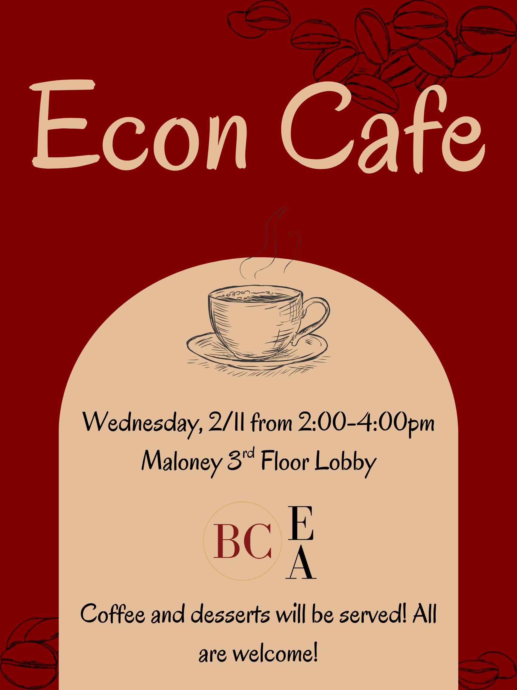 The next Econ Cafe will take place on Wednesday, February 11th from 2-4pm in the Econ Department lobby. Stop by to enjoy some snacks and coffee as you get to know other economics students!
