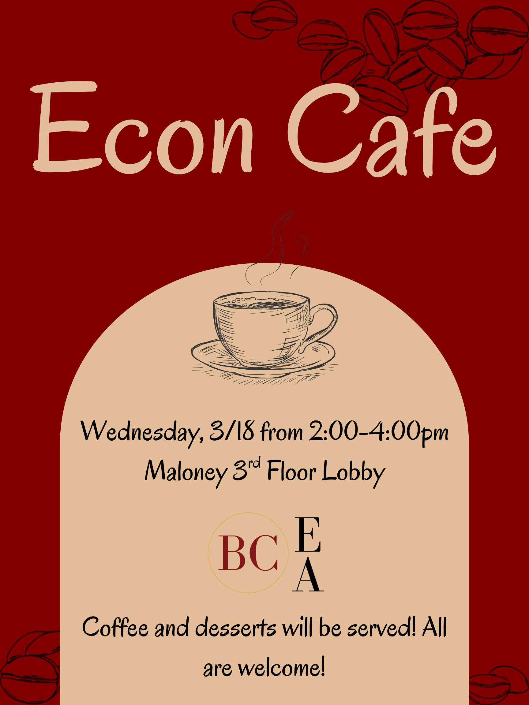 The next Econ Cafe will take place on Wednesday, March 18th, from 2-4 pm in the Econ Department lobby. Stop by to enjoy some snacks and coffee as you get to know other economics students!